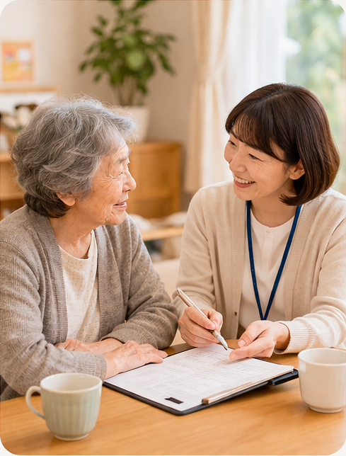 初めての介護で不安な方にも、分かりやすく丁寧にご説明します。どうぞお気軽にご相談ください。