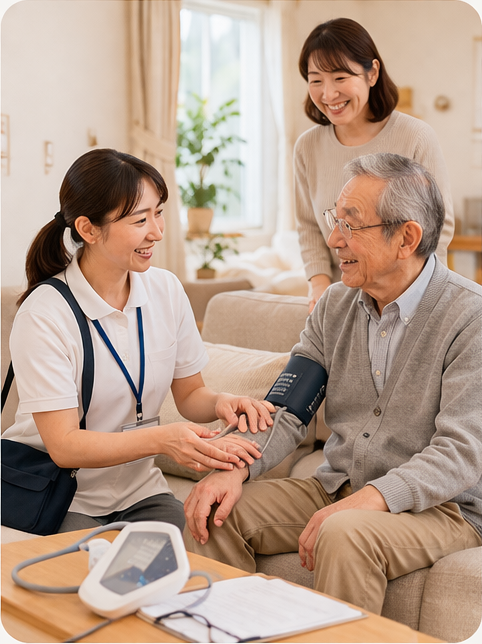例えば、医療的な管理が必要な方や体調の変化が心配な方に対しても、訪問看護との密な情報共有により、迅速で適切な対応が可能です。介護サービスだけではカバーしきれない部分も含めて、安心して在宅生活を続けられるようサポートいたします。
